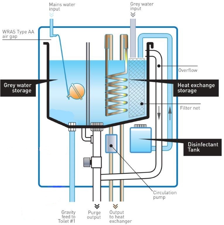 Some storage-type systems have tanks containing a reservoir of clean water. Drain water flows through a spiral tube at the bottom of the heat storage tank. This warms the tank water, which rises to the top. Water heater intake water is preheated by circulation through a coil at the top of the tank.